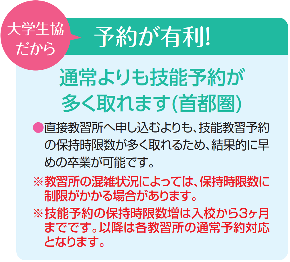 一般よりも技能予約が、優先的に取れる教習所もあります