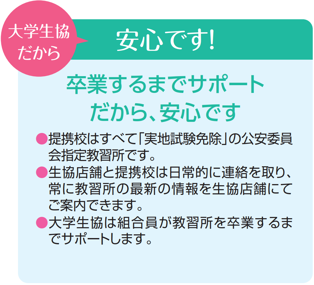 運転免許の申し込みや詳しい内容のお問い合わせは足利大学生協まで