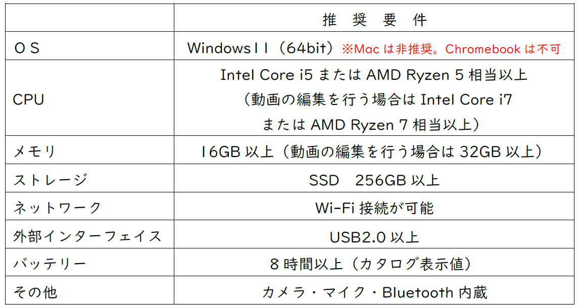 大学より案内にある、4年間の学生生活で使用することと大学に持参することを踏まえ、下記に推奨するパソコンの仕様を