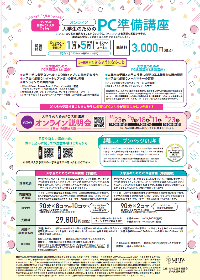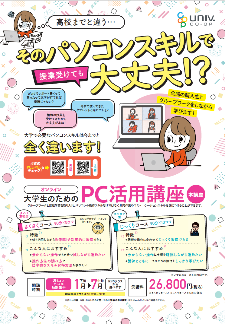 オンラインで開催する大学生のためのPC活用講座のご案内です。