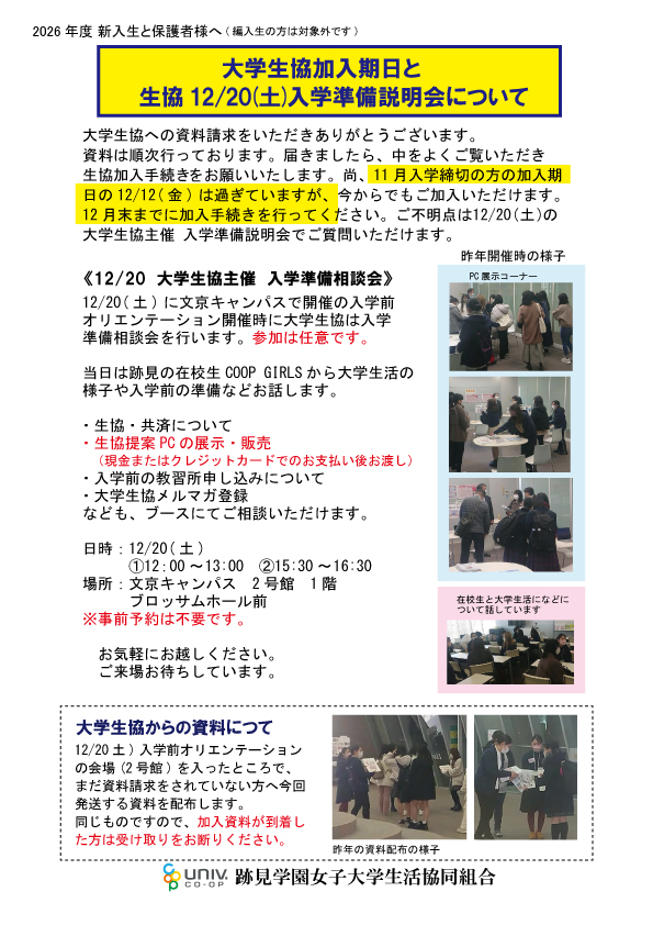 2026年度 ご入学予定者様で生協加入をされていない方は、先ず大学生協へ資料請求を行ってください。