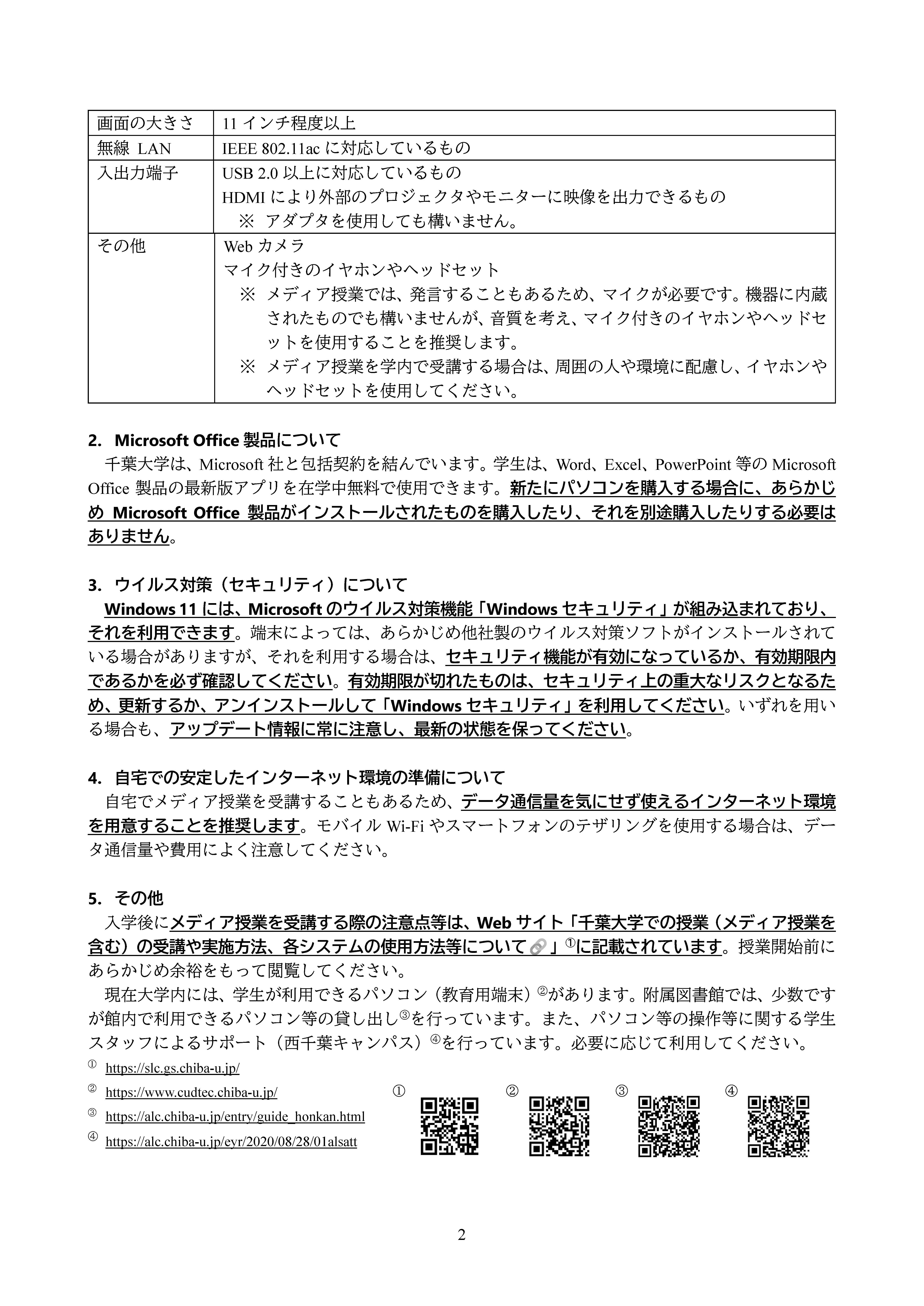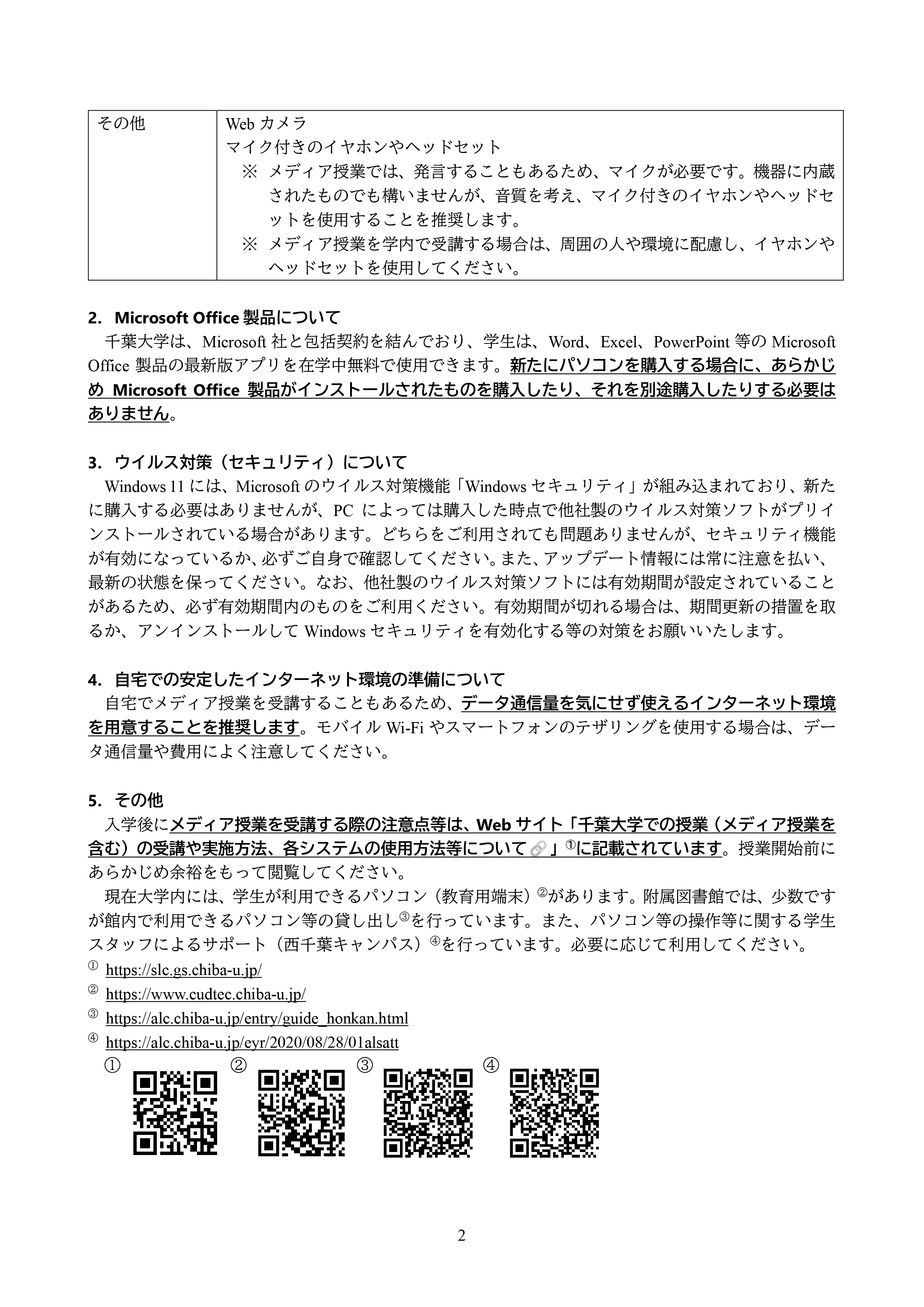 千葉大学資料より 学生生活で用いるパソコンの推奨仕様について