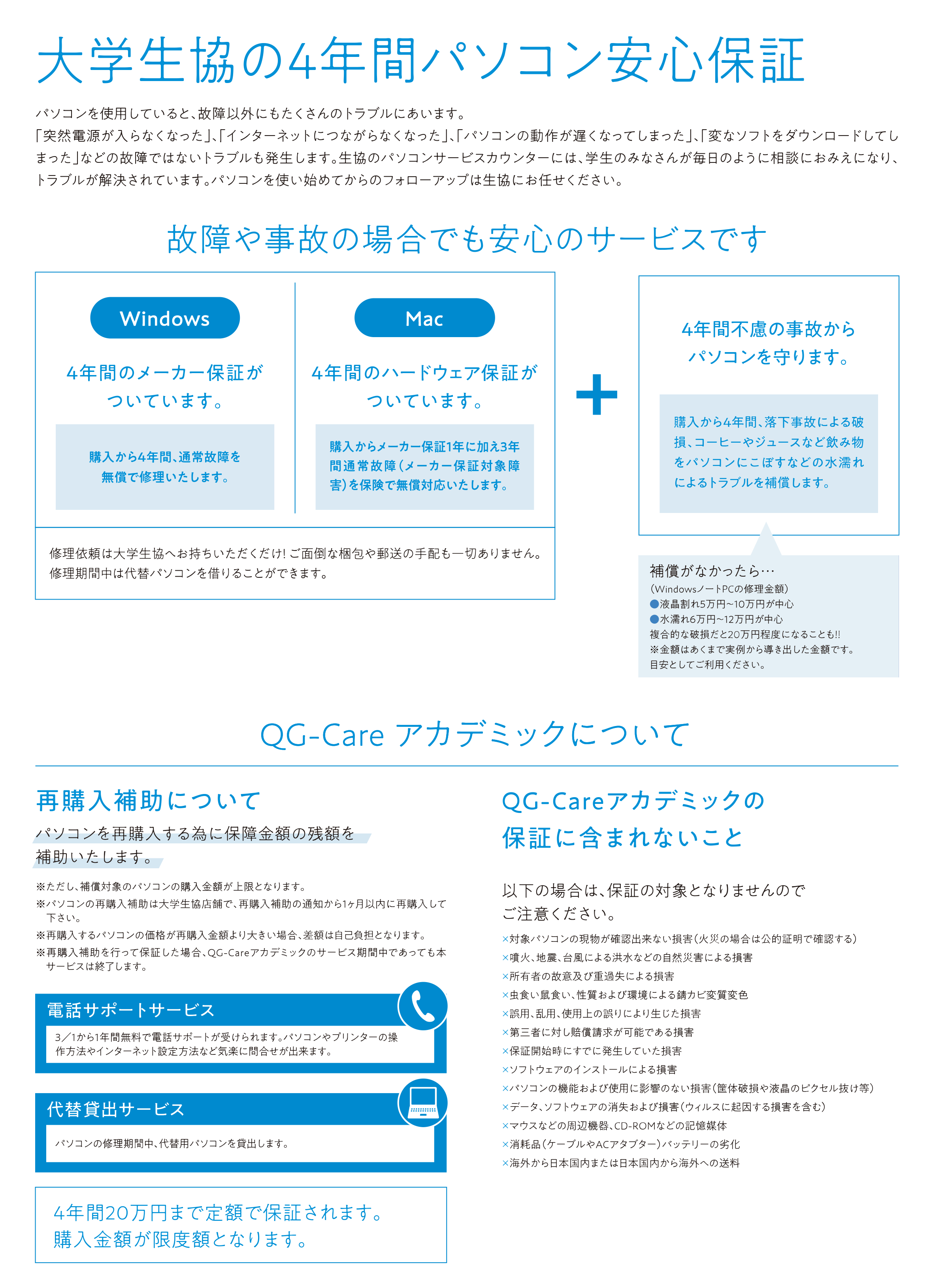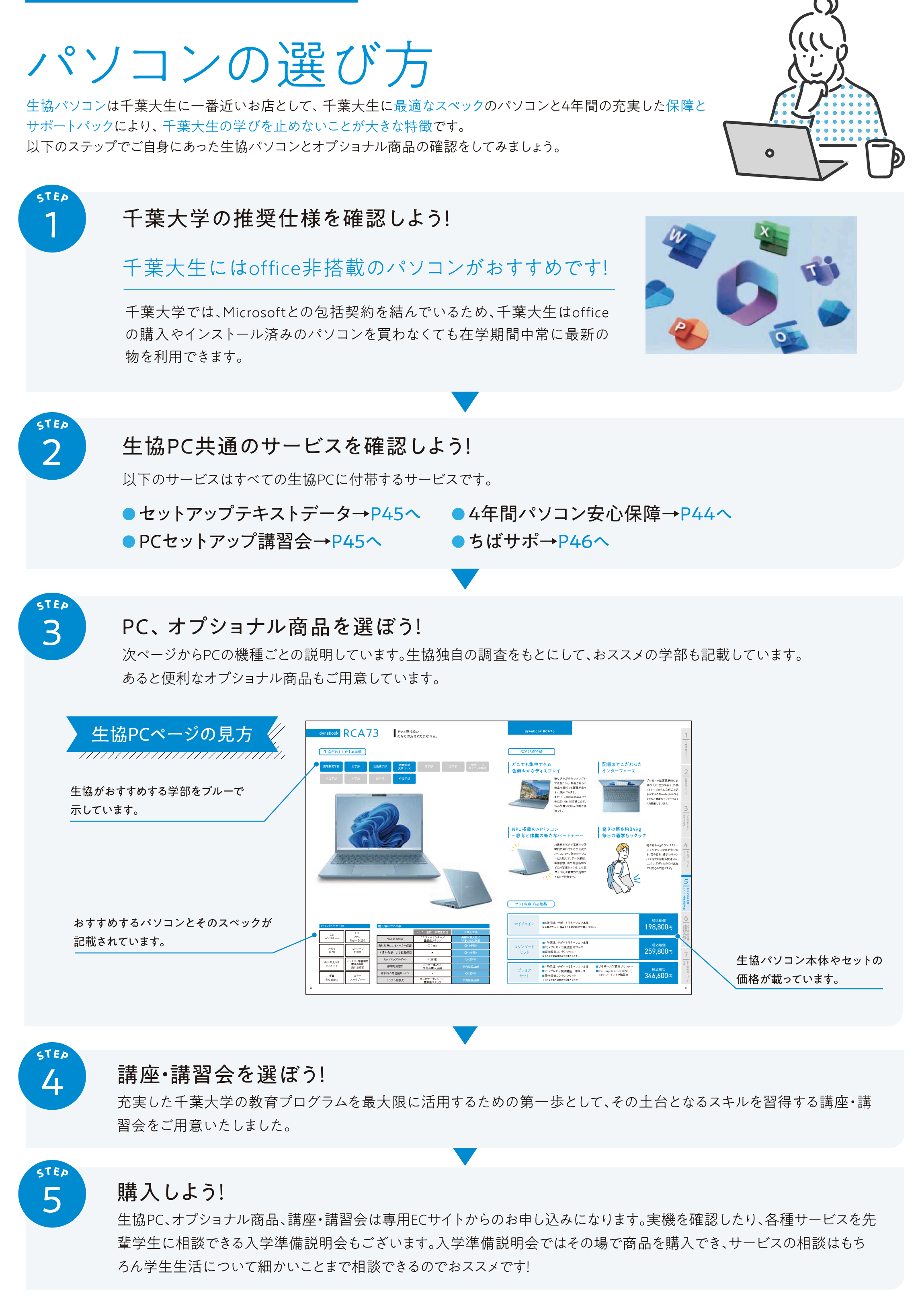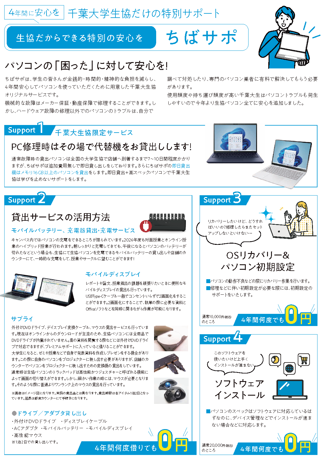 千葉大生協では先輩学生や学内でのヒアリングを基として千葉大生におすすめのパソコンを選定し、4年間安心保障・特別サポートパック、千葉大生の不安から生まれた各種講座を用意しています。