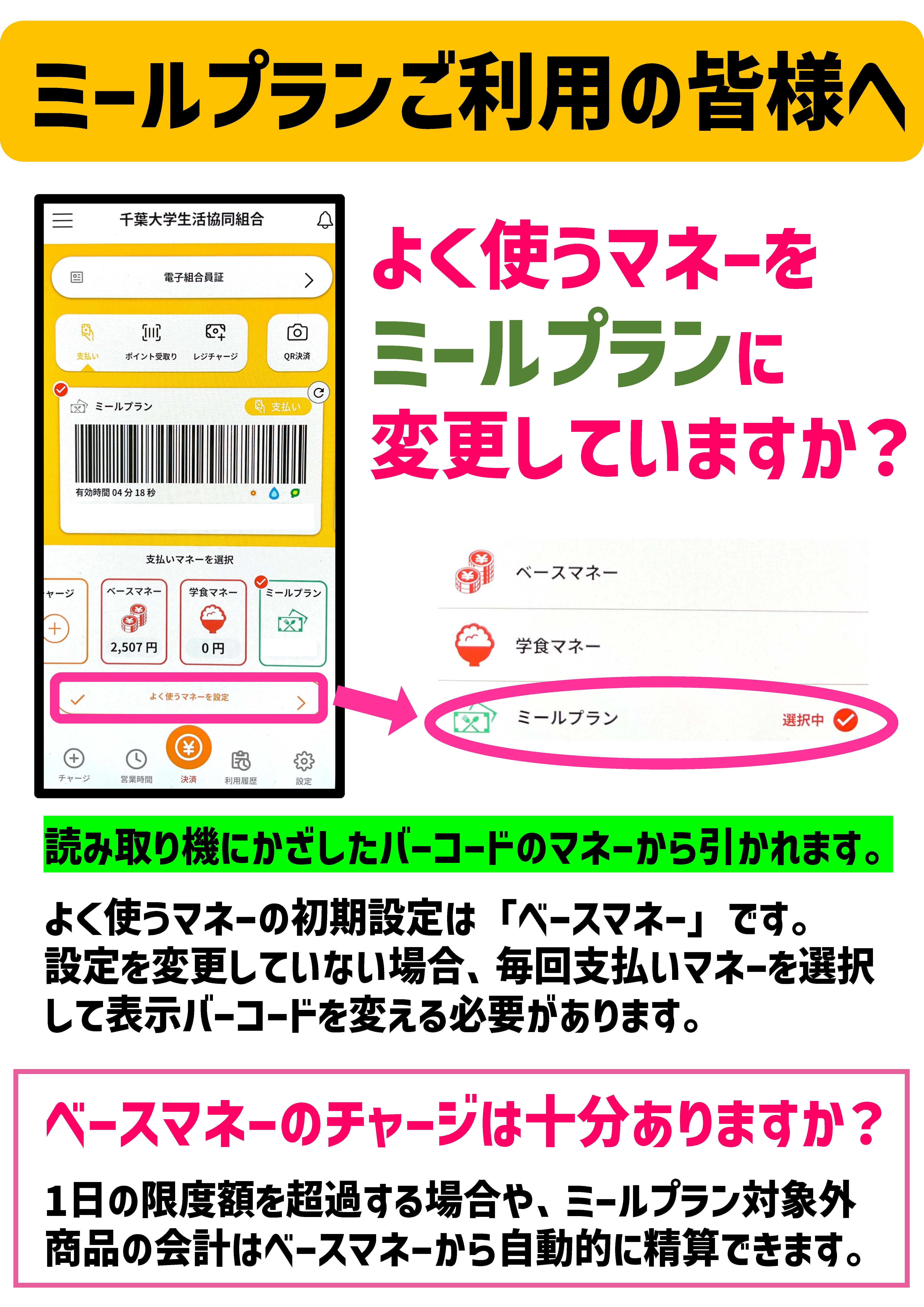 つまり、ミールプランに加入していても、ベースマネーのバーコードを読ませてしまうとベースマネーで決済されます。