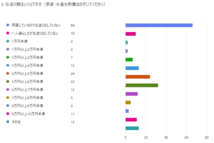 農家なのでお米は送ってます。食料もたまに小包でおくりますが、やりくりしてるようです。バイト代で趣味や洋服などに使っているようです。(文学部)