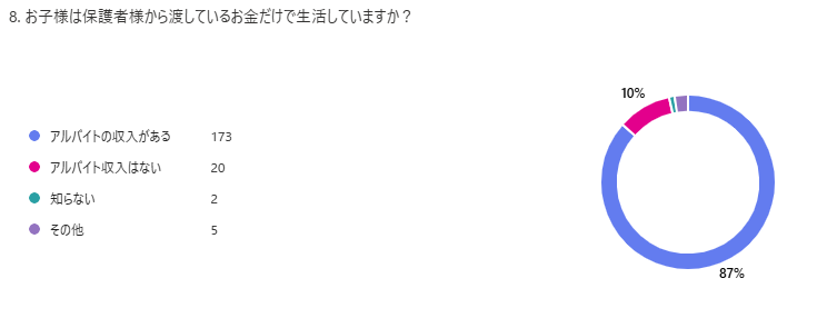 生活をする上で必要なもの(食品、日用品、光熱費)は親が仕送りで、それ以外は子どものアルバイト代でやりくりしてもらっています。(医学部1年)