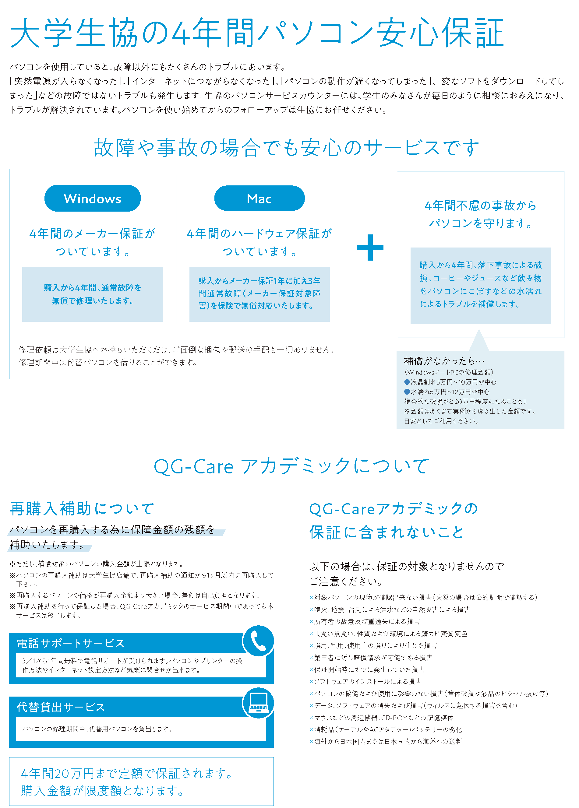 また生協パソコンは修理金額が保険の範囲を超えた場合も、生協での再購入補助費用に充てることができるため、安心です。