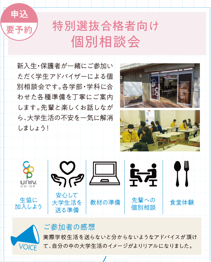 特別選抜合格者向け個別相談会でお話しする内容は、3月の入学準備説明会(個別)と同じです。3月の説明会は対象人数が多く混雑が予想されるため、特別選抜合格の方は可能な限り2月の相談会にご参加をお願い致します。