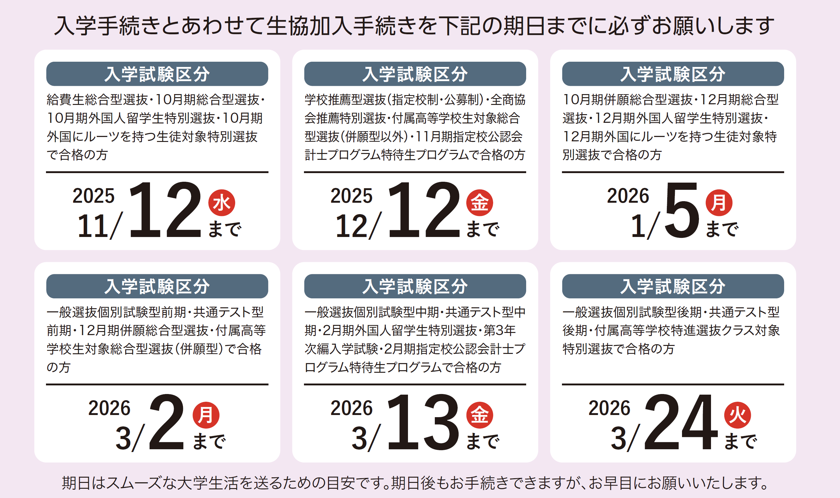 下記の手続き期日までに、必ず生協加入のお手続きをお願いいたします。