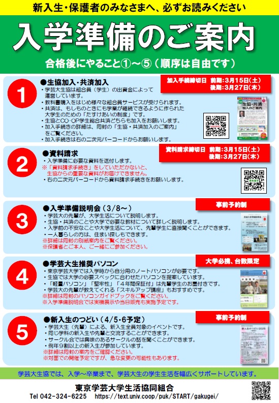 ●東京学芸大学生協では、合格後~入学前に必要な情報や購入する教材等について、
