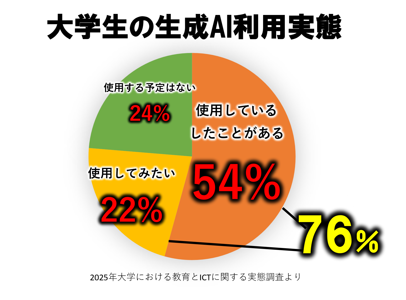 ChatGPTをはじめとする生成AI(Generative AI)が急速に普及し、大学教育・研究の現場にも大きな変化をもたらしています。2025年に行った「大学における教育とICTに関する実態調査」では多くの大学生が生成AIを活用していることがわかります。2026年に入学される皆様が卒業されるまでにはさらにAI活用が広がり、卒業後、就職してからもさらに広がりを見せることが想定されます。