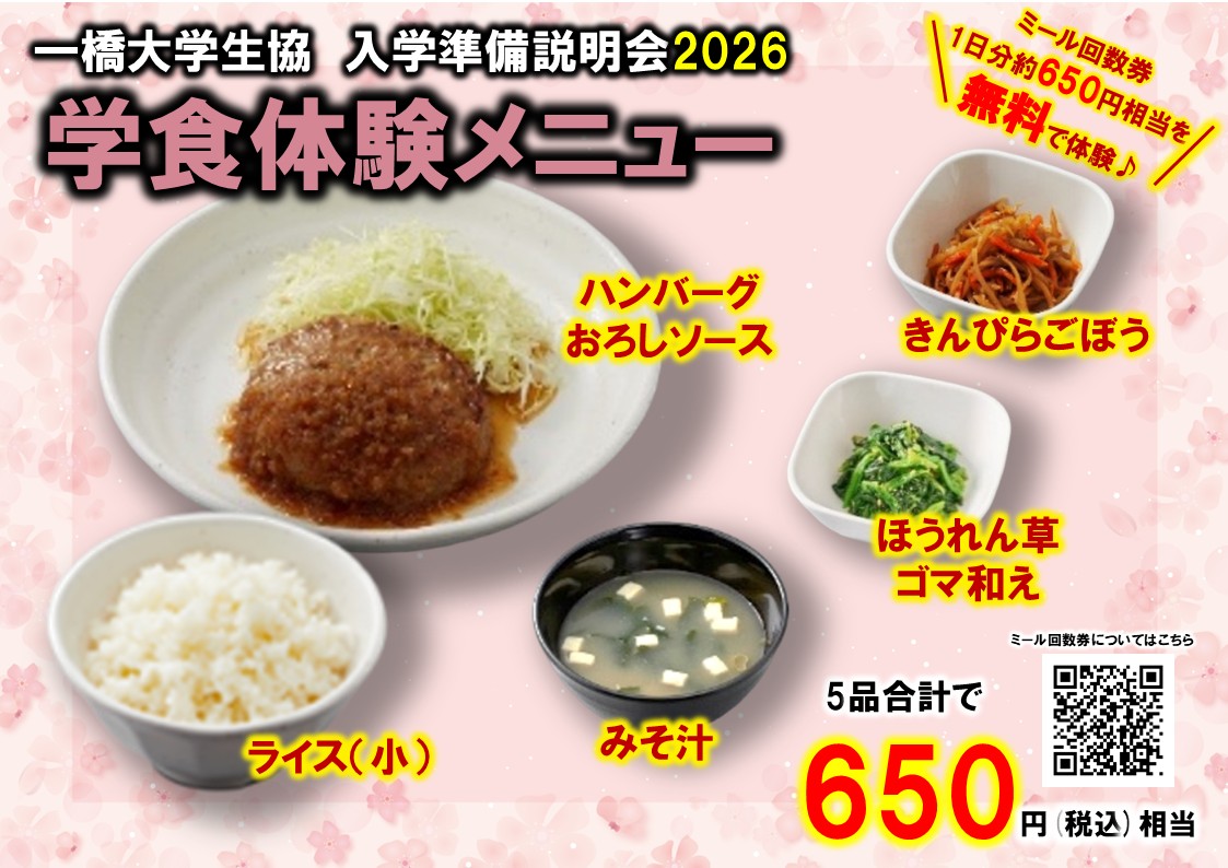生協の運営する学食体験ではミール回数券1日分約650円相当のメニューを無料で試食することができます。