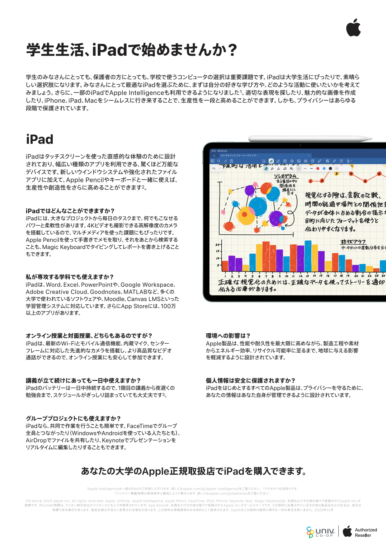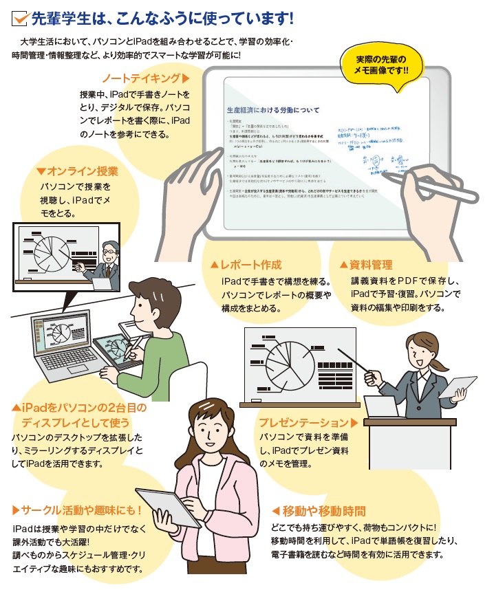 私の所属している経営学部では、講義資料がPDFで配布されることが多く、紙での配布がありません。別にノートを取ると荷物が増え、PCでメモを取るのも慣れない人には大変です。しかしiPadならPDFに直接書き込めてフォルダ整理も簡単なのでとても便利です。テスト勉強の際も書き込んだPDFをそのまま見返せるので、効率的に復習できます。