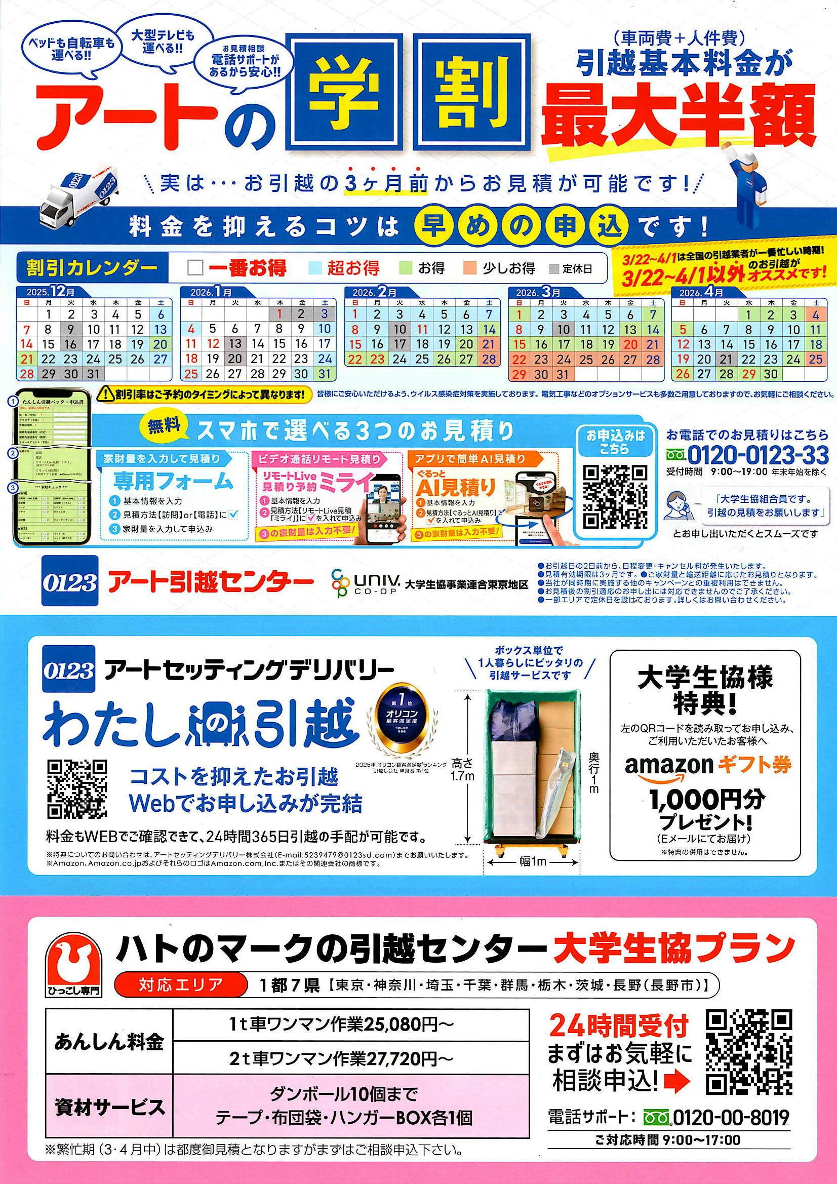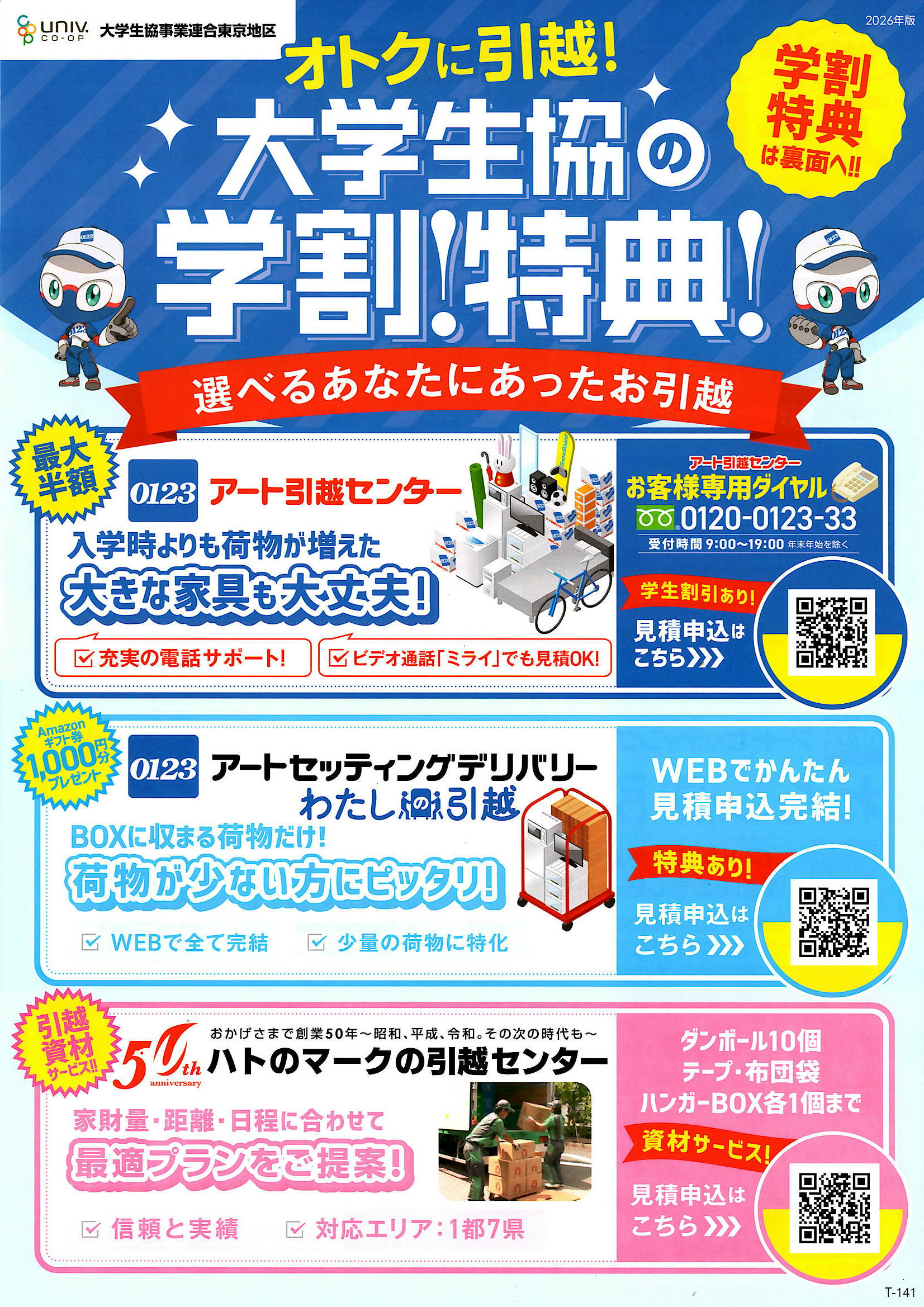 生協では、大学入学を機に一人暮らしをされる方のために提携会社のお得な引越しサービスプランをご用意しています。
