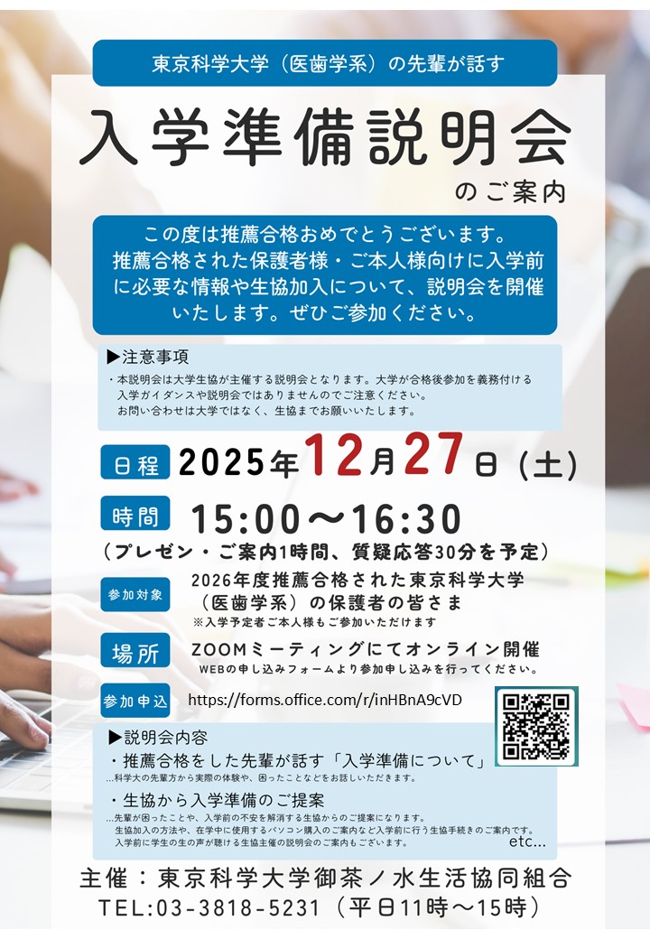 東京科学大学御茶ノ水生協では、東京科学大学(医歯学系)に合格された皆様に対して入学前の不安や疑問を解決するため「推薦合格者向け保護者説明会」を開催いたします。ぜひご参加ください。