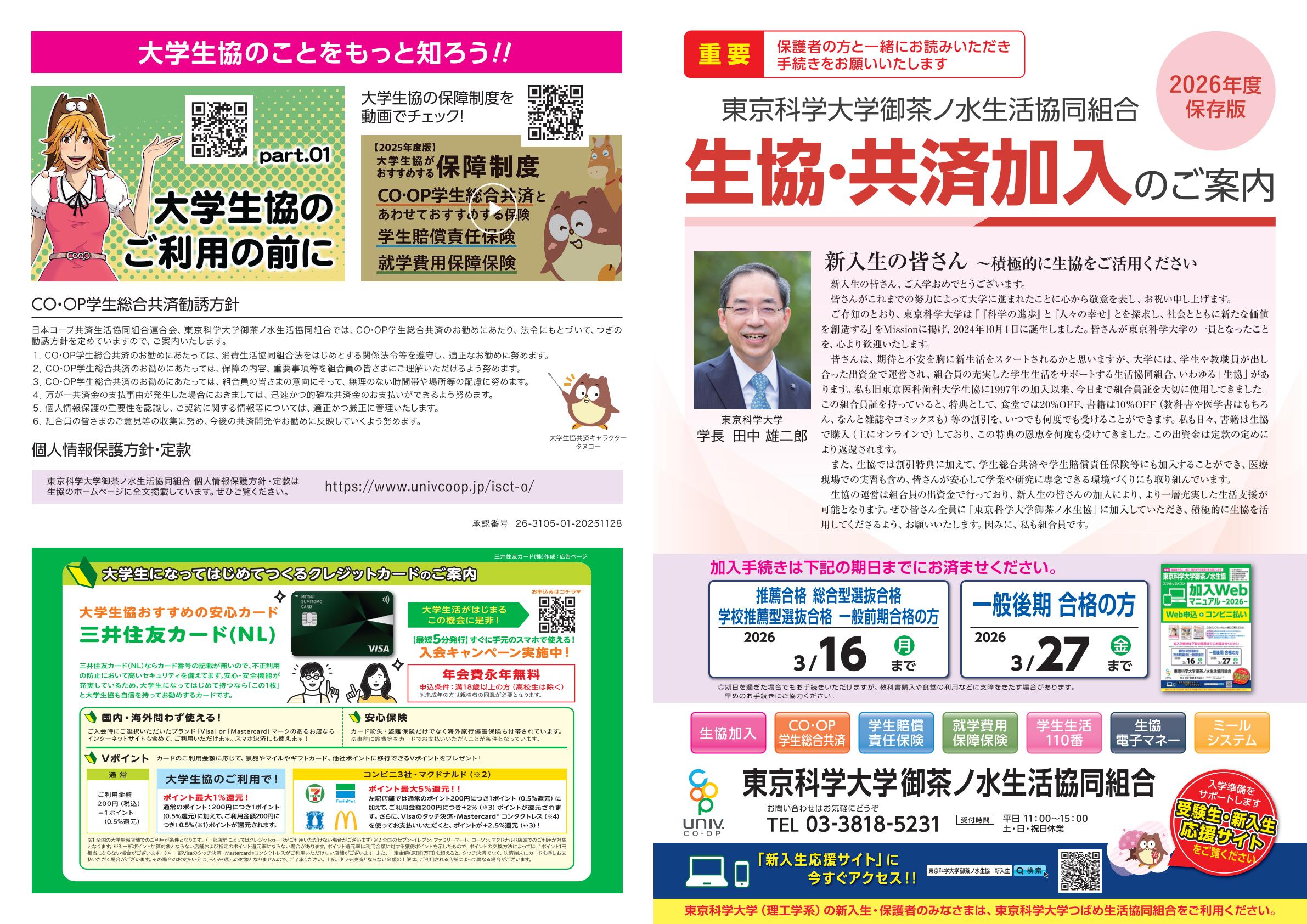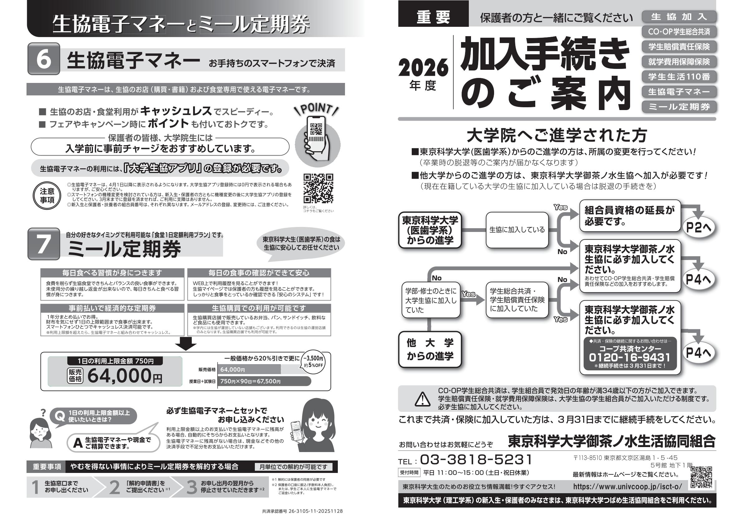 生協が今後充実していくためにはみなさんの協力が必要です。学生・教職員がいっしょになって、心身ともに健康で有意義な学園生活を送るために、どうかすすんで生協に加入されるようお願いします。生協の具体的な事業活動、加入のメリット等は加入案内をご覧ください。