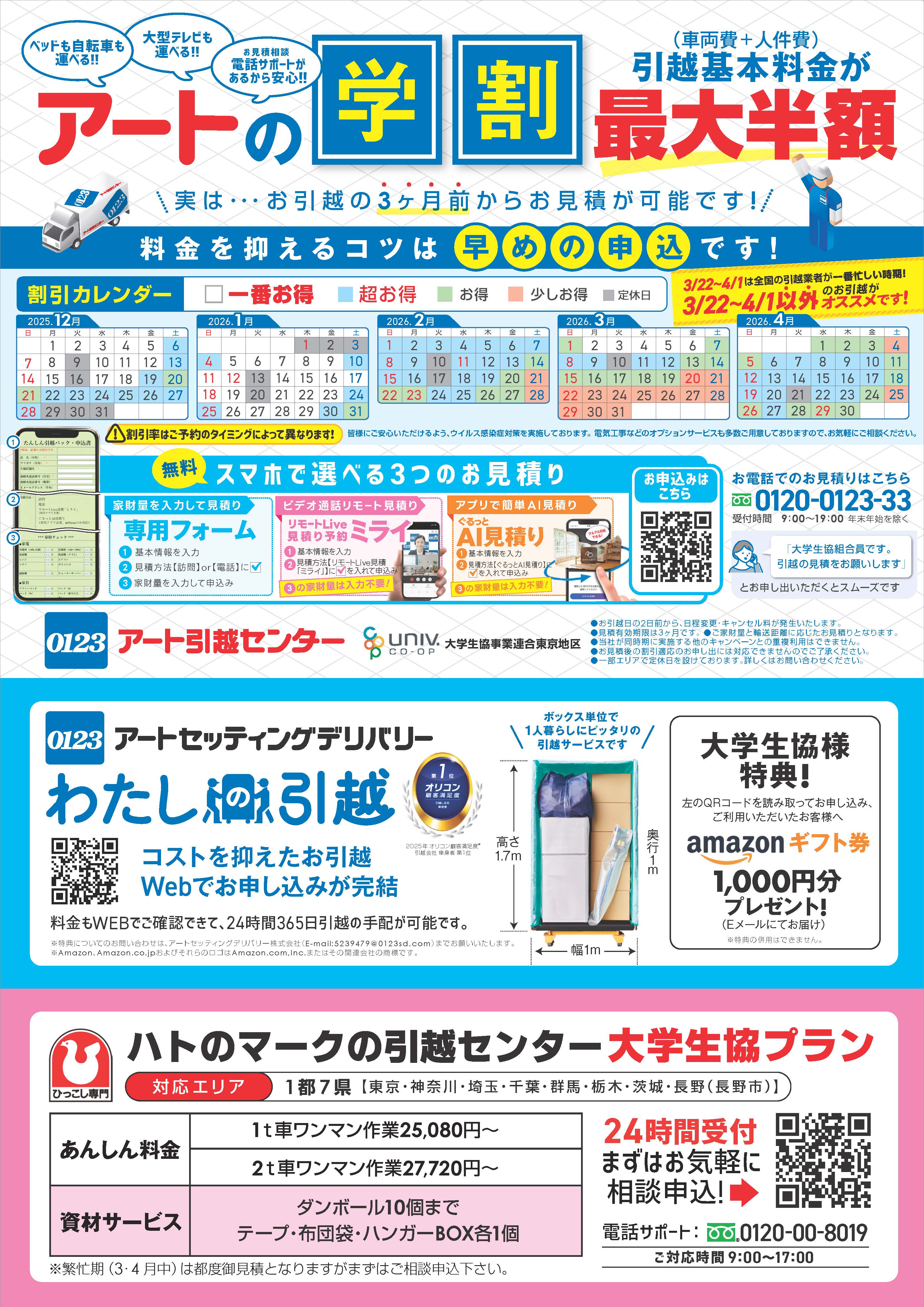 生協では、大学入学を機に一人暮らしをされる方のために提携会社のお得な引越しサービスプランをご用意しています。 各社、大学生協ならではの特典をご用意してお待ちしております。ぜひご検討ください。 2026引越しチラシ.pdf
