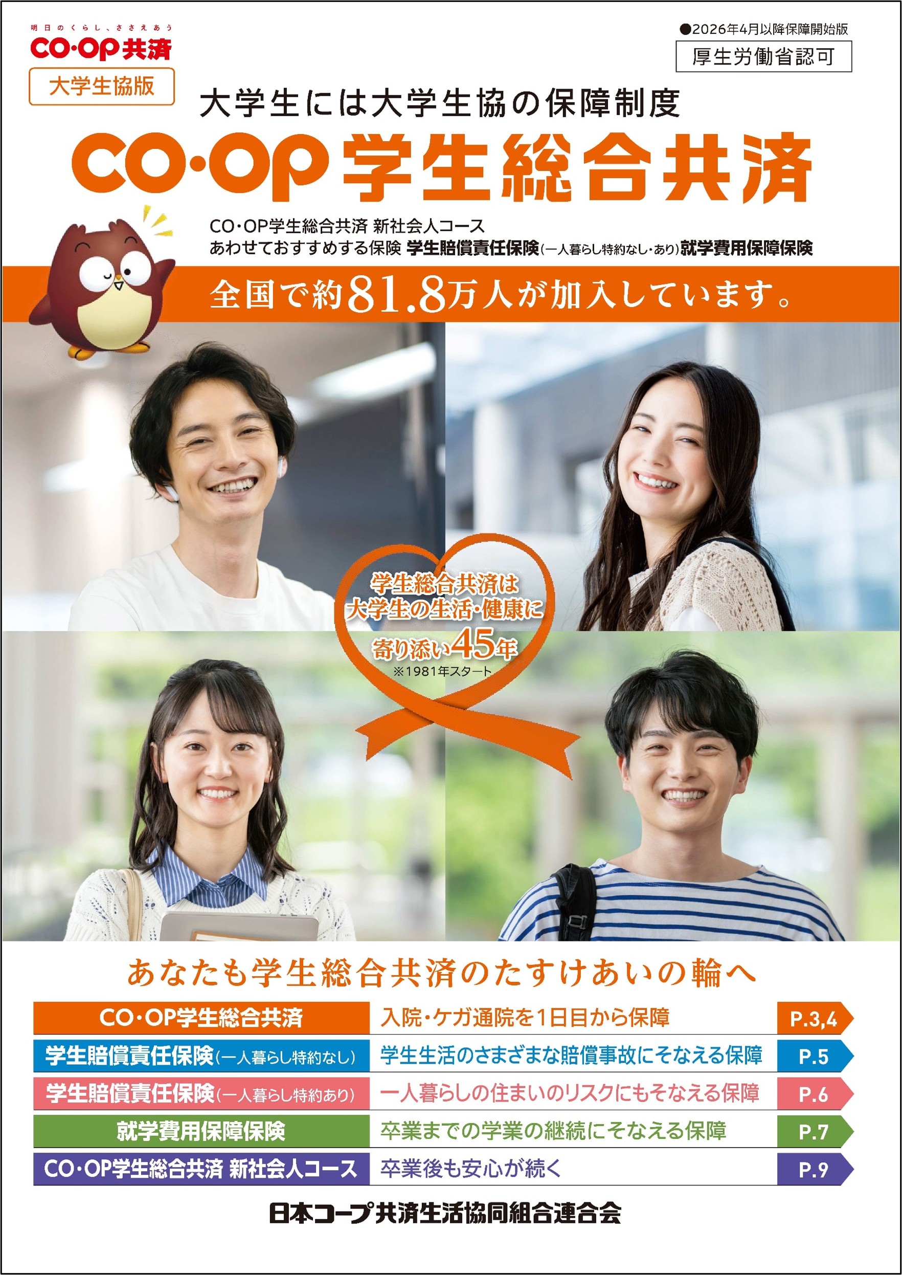 生協は学内で、カフェテリア食堂や購買書籍部を運営しており、ご利用いただくために学生のみなさんに生協へ加入していただいています。共済は、みんなで出し合ったお金で、病気やケガで困っている全国の学生を支援する助け合いの制度です 。