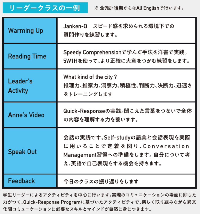 リーダークラスはこの先輩リーダーが運営します。もとから英語が得意だった先輩ばかりではなく、新入生のみなさんと同じように大学に入ってからコミュニケーション英語のトレーニングを始めています。身近なお手本として先輩からも学べることがたくさんあります。