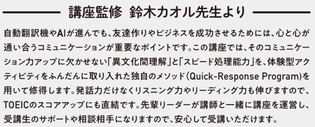 この講座独自のQuick Response Programに基づいて、日本人講師だからできるスピード処理能力や異文化間理解の力をスムーズに身につけさせていきます。