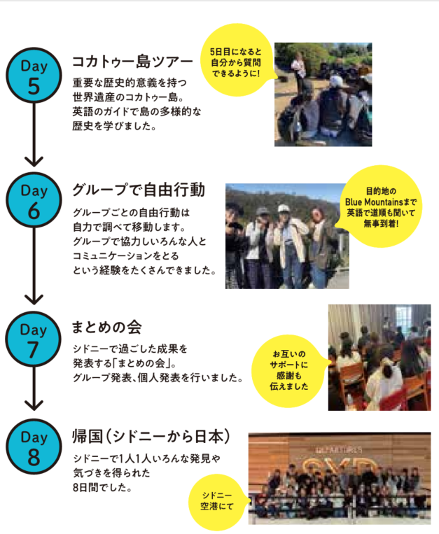 世界中から集まる人が英語でコミュニケーションしている国オーストラリアで、講座生だけを対象にした受講生同士で助け合い・学びあいながら視野が広がるプログラムを体験でき、自分の「伝える英語」の現在地がわかるモチベの上がる8日間です。