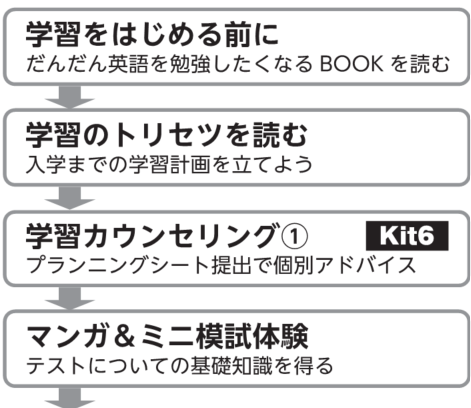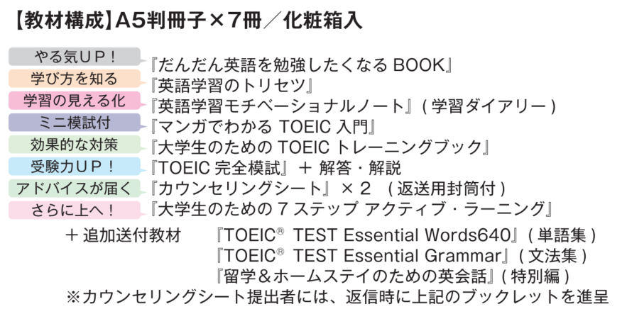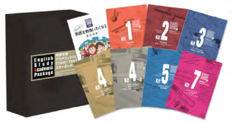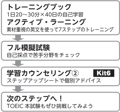 TOEIC®TEST スターターキットは、kit0~kit7までのオリジナルテキストと、対応する音声、さらにカウンセリングシートで構成されています。TOEIC®対策のトレーニングブックだけでなく、本番と同じ完全模擬テスト、テストの概要を知るためのマンガ、日々の学習記録をつけるためのダイアリーなど、必要なパーツが全て含まれています。