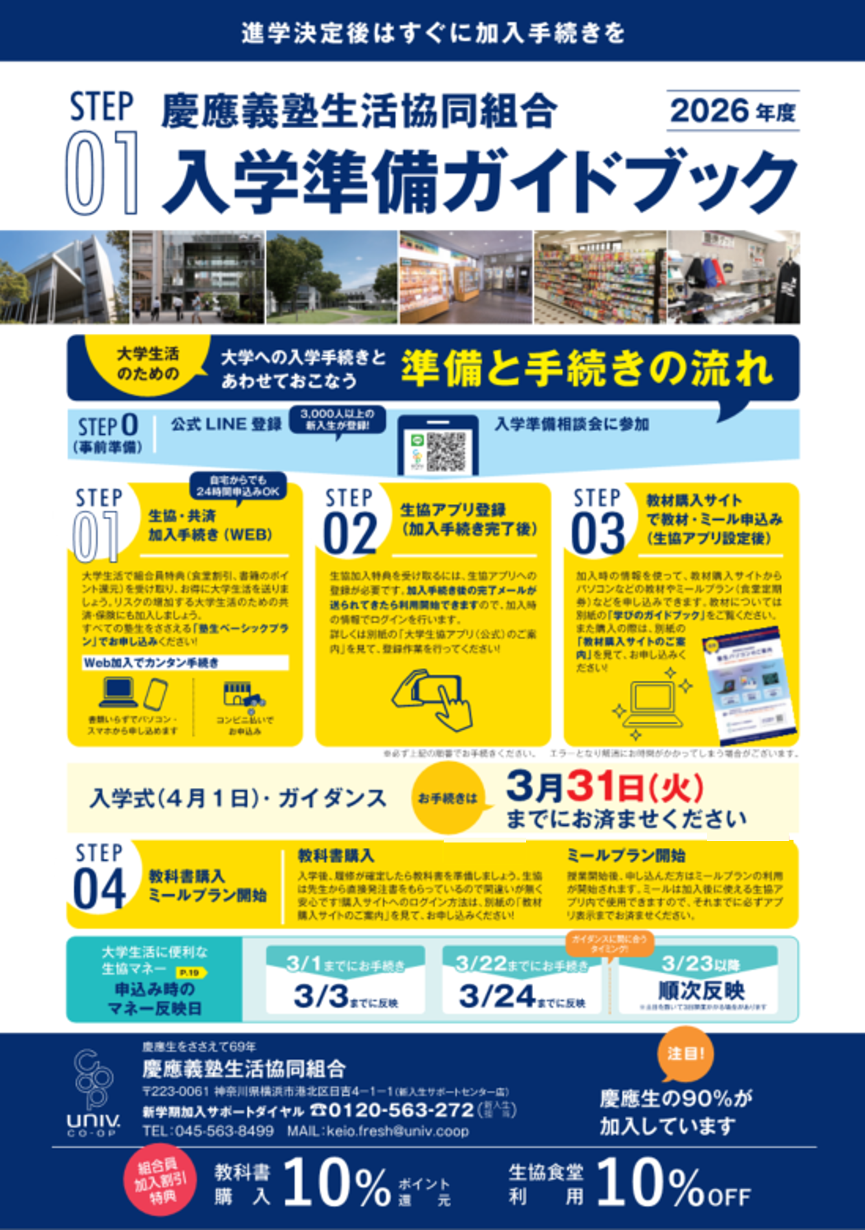 慶應義塾生協は、慶應義塾の学生・院生・教職員が出資金を出し合い、大学生活を豊かにするために運営されている福利厚生団体です。