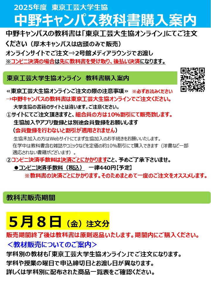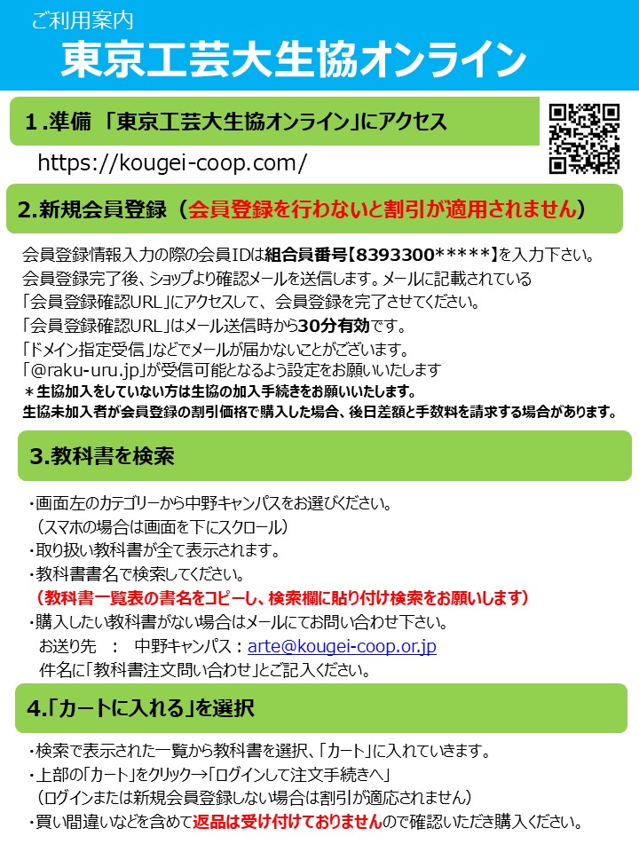 - 教科書は生協のお店で販売していますが販売期間中にお願いします。それ以降教科書・教材はお取り寄せになり入手まで時間がかかります。必要な教科書はなるべくに早めに購入してください。