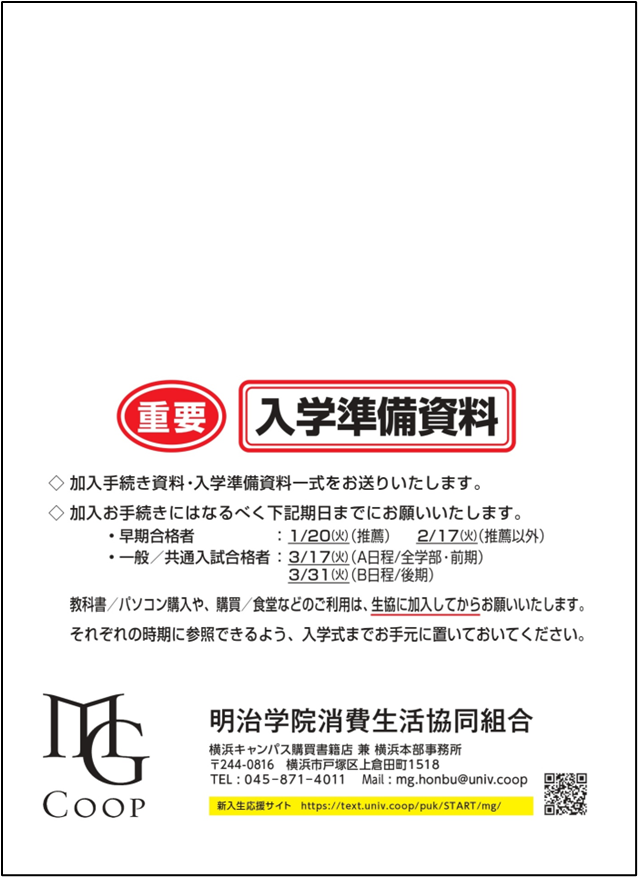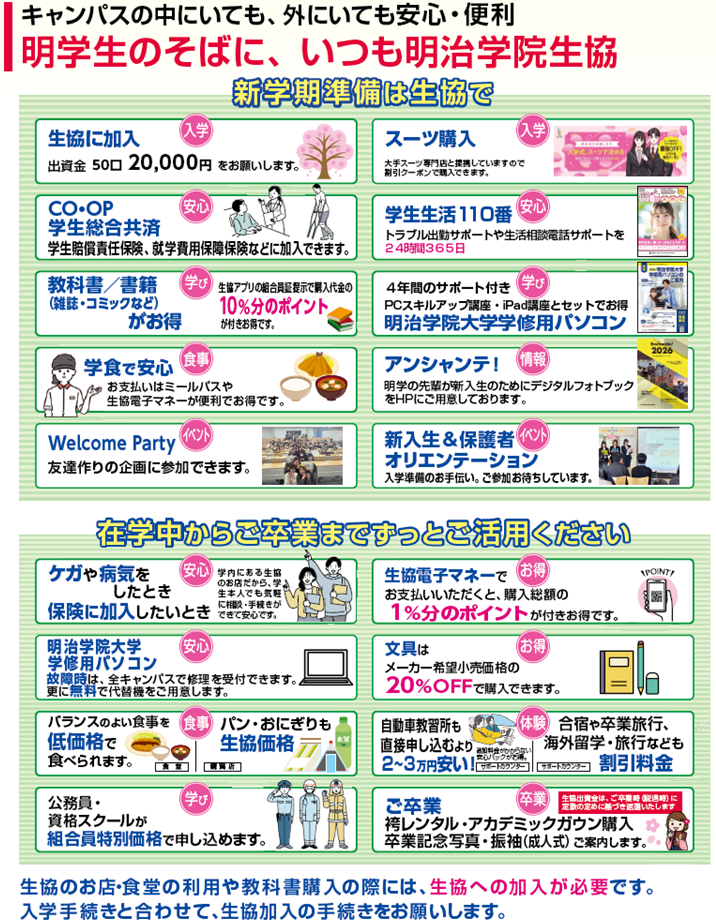 ぜひ、明治学院大学の一員になられた皆さんには明治学院生協への加入をお願い申し上げます。