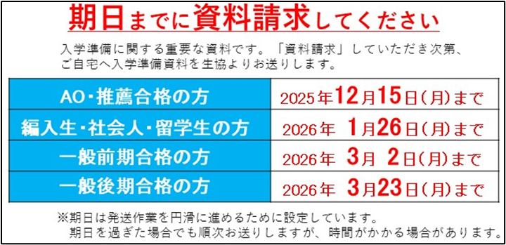 「資料請求」していただき次第、生協からご自宅へ入学準備資料をお送りいたします。