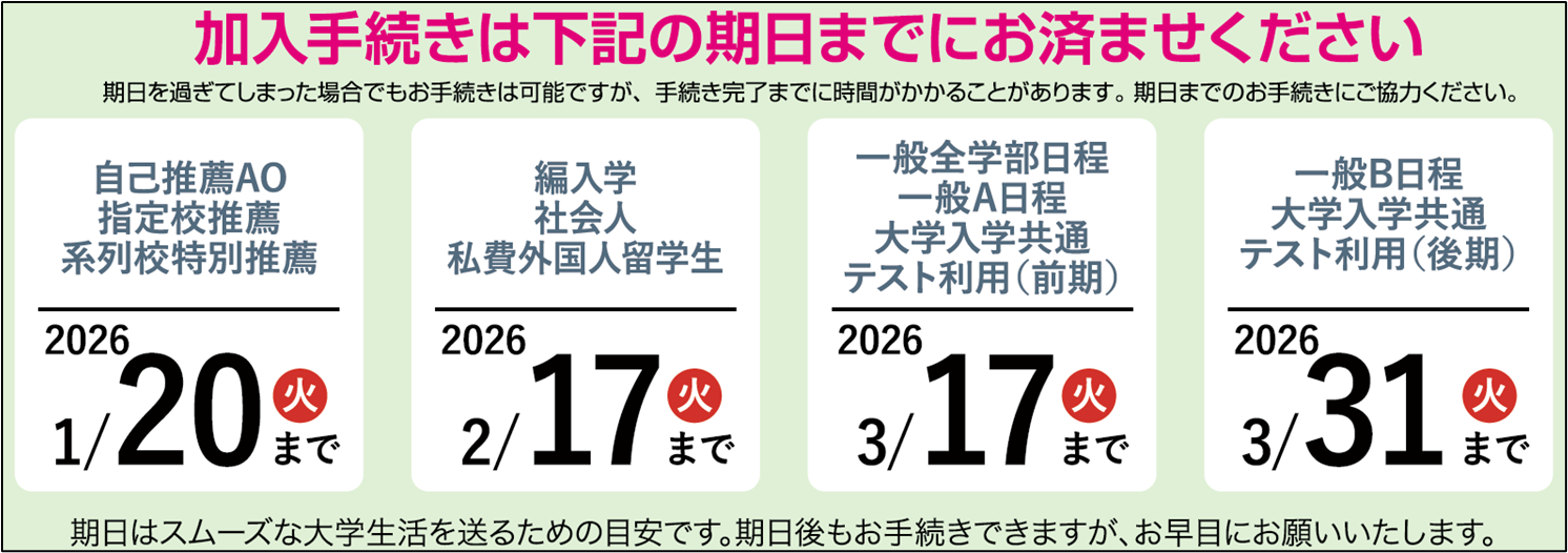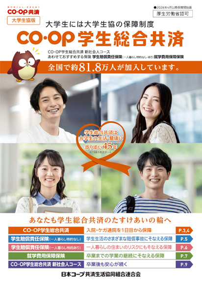 CO・OP学生総合共済、学生賠償責任保険、就学費用保障保険、学生生活110番、生協電子マネー、ミールパスについて追加加入が可能です。新社会人コースの事前申し込みのみ、コープ共済センター(0120-16-9431)にお電話でお申し出ください。