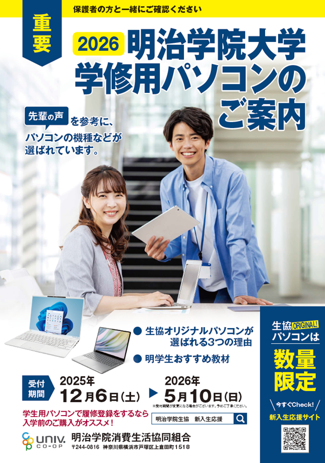 生協では大学と一緒に明治学院大学学修用パソコンをご提案させていただいております。