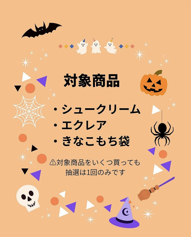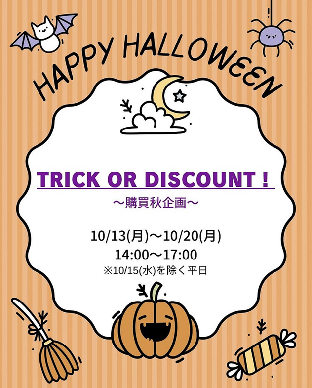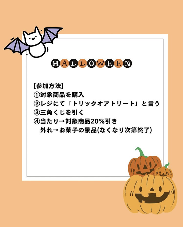 期間内でHalloween関連対象商品を購入して、くじを引くと割引orお菓子をプレゼントする企画を実施しました。