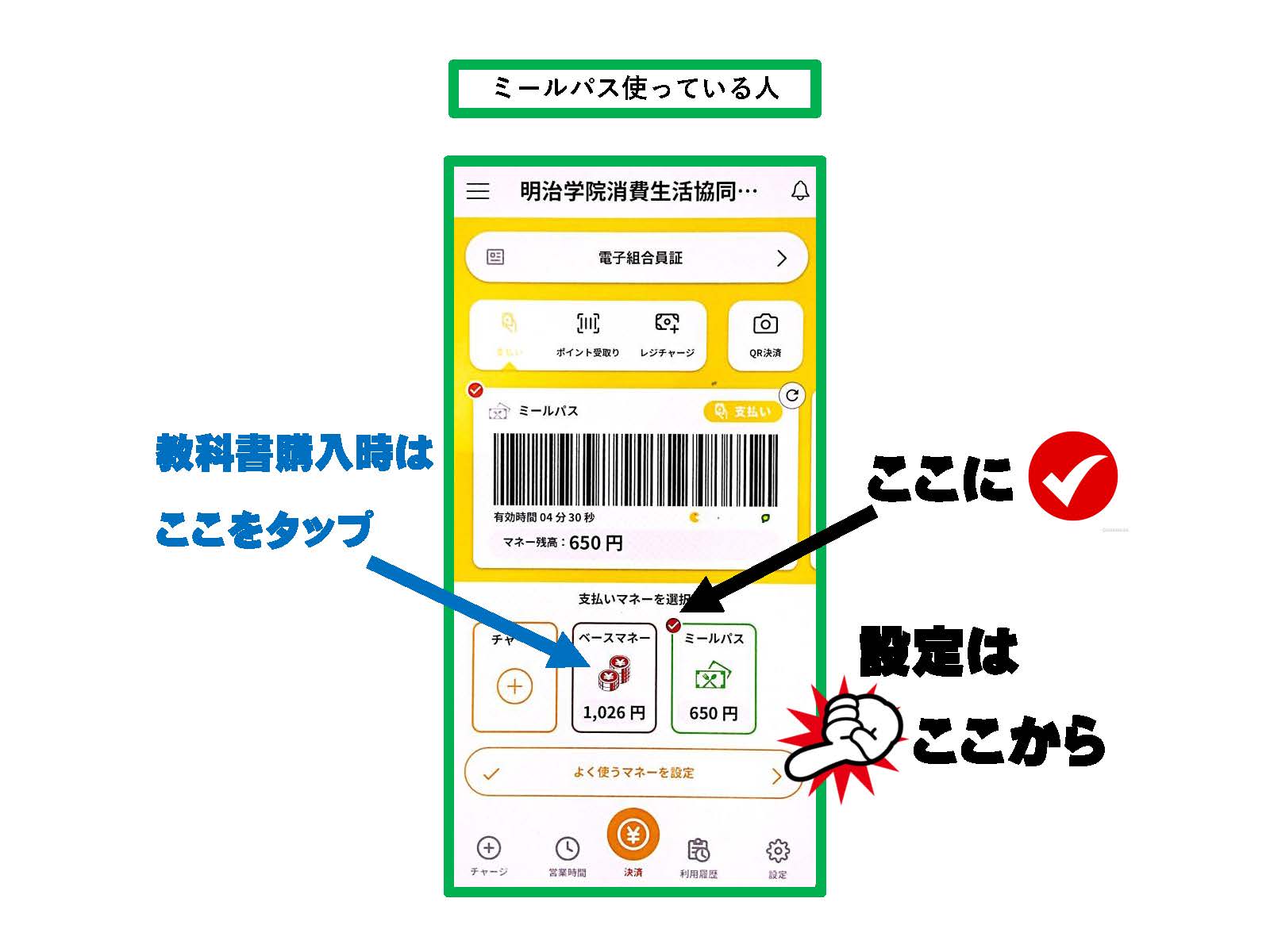 ※上記設定を完了しておくと、ミールパスが利用できない期間のお支払は自動的にベースマネーから決済されます。