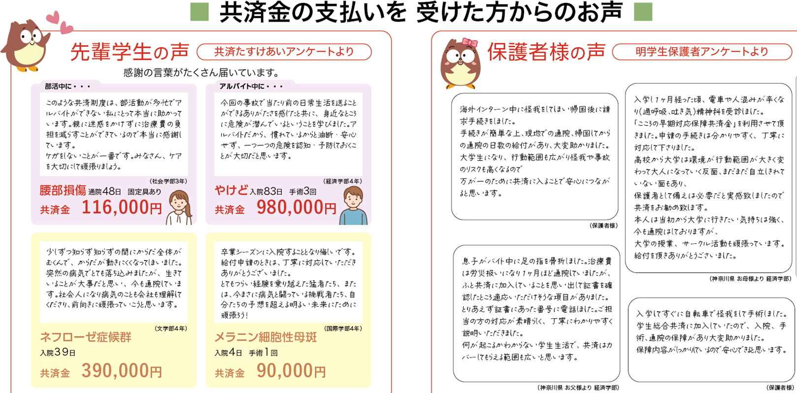 CO・OP学生総合共済は、他の保険から保険金が支払われた場合でも共済金の請求手続きはできますので、もしもの際には、他の保険とあわせてより厚い保障ができます。CO・OP学生総合共済の共済金は定額保障ですので、医療実費以外の支出に充当できることも選ばれている理由です。