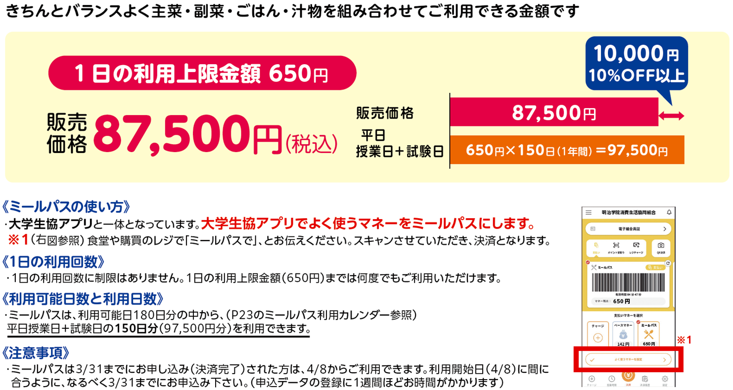 - 事前申し込み側の「生協食堂、購買食事の1日定額年間定期券」