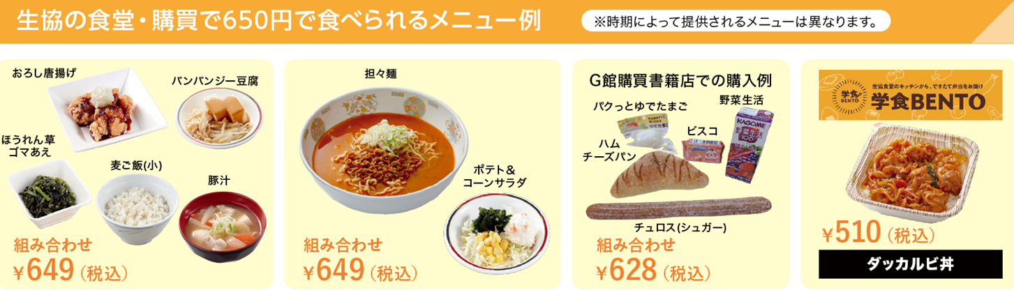- 生協の食堂で食べられるメニュー例(テイクアウトも可能)