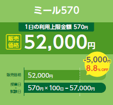 100日の利用に達するまでは、利用日に570円ずつ利用できるようになります。お支払いはミール定期のコードをレジにかざすだけ。