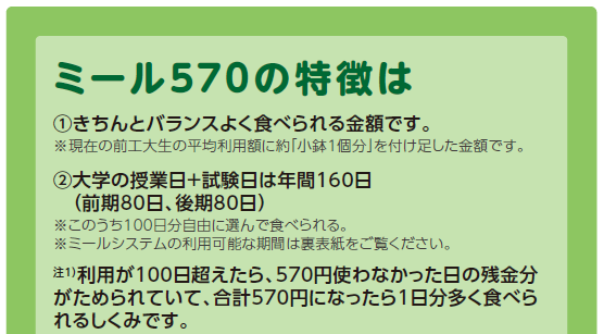 1食287円の食事では、1日に必要なエネルギーや栄養素を満たすことはできません。前払いで食費が保証されているミールシステムは、学生さんも保護者のみなさんも安心して生協食堂で昼食を召し上がっていただけるのではないでしょうか。