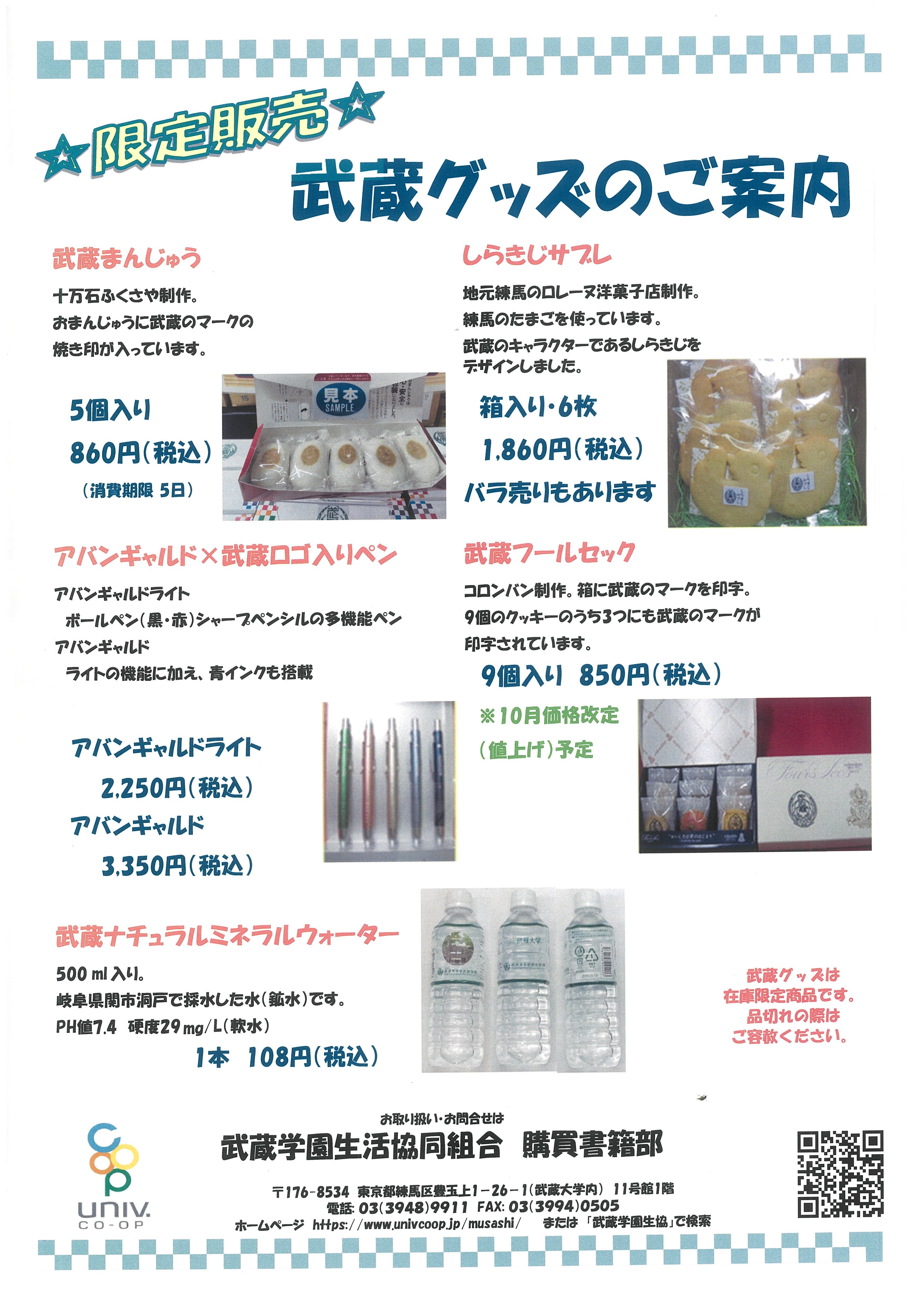 (生協本部事務室受付 平日10:30~16:30 学事によりお休みや短縮の場合があります)