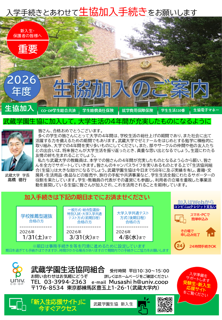 2026年度入学予定の皆さん、武蔵大学合格おめでとうございます。