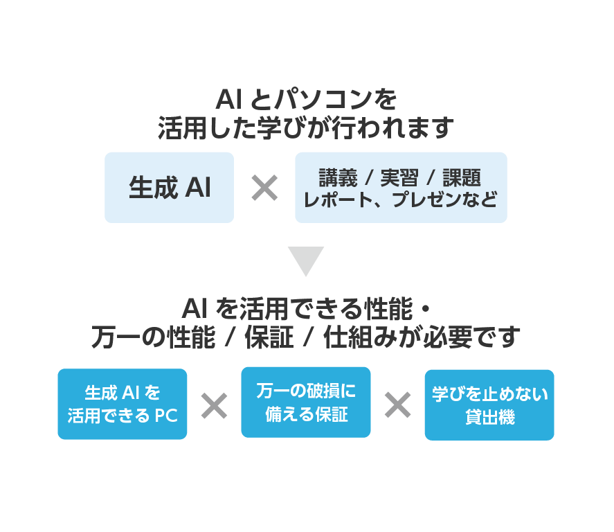 AI を取り入れた授業に対応するためには、必要な性能と保証を備えたパソコンが必要です