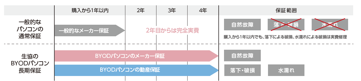 - 一般の長期保証の範囲は「通常使用での故障の場合」が大半です。新潟青陵大学・短期大学生協のBYODパソコンは、4年間のメーカー保証だけでなく「不注意などによる故障・破損(例えば落下や液体こぼしなど)」でも保証の対象となります。大学生のパソコン活用においては、使用頻度の高さゆえに修理件数の約半数が「破損」によるもの、つまり本来はメーカー保証が適用されない修理になります。