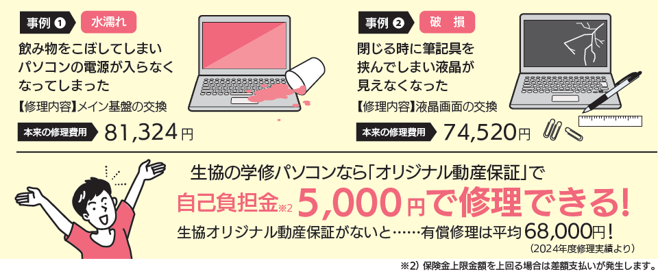 - 毎日ハードに使う大学生のパソコンは、一般的な保証ではカバーしきれません。生協の学修パソコンには、購入時から4年間のオリジナル保証が含まれています。正常な状態での動作不良(自然故障)は無償で修理可能な保証と、不慮の事故などによる破損などで使える動産保証のダブル保証です。