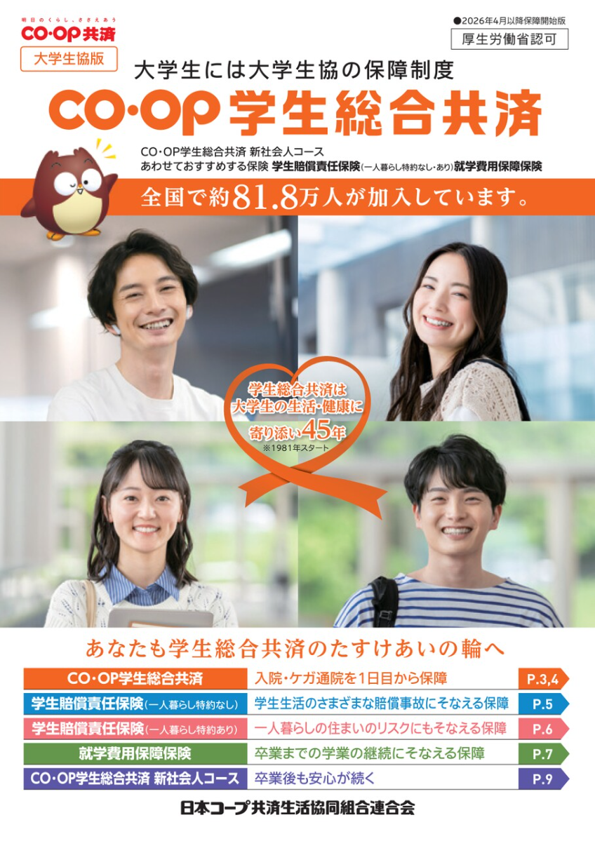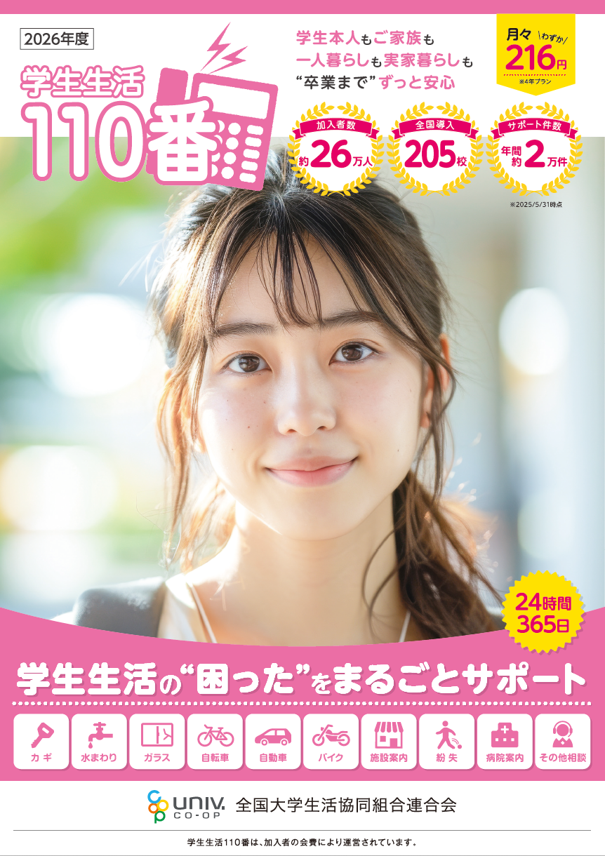 万が一の事故や病気に備える「学生総合共済」、入っていると安心「学生生活110番」などの加入をお勧めいたします。