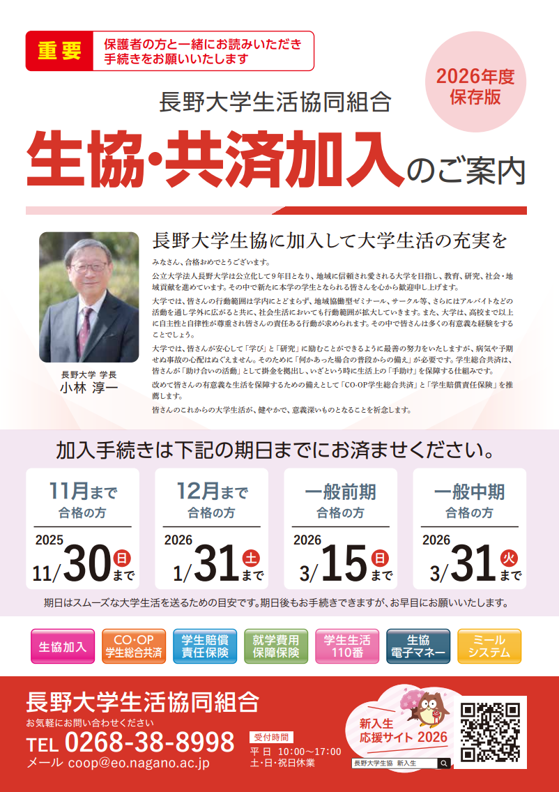 - 生協がおすすめする「長野大生基本プラン」または「安心プラン」での加入手続きをお願いします。
