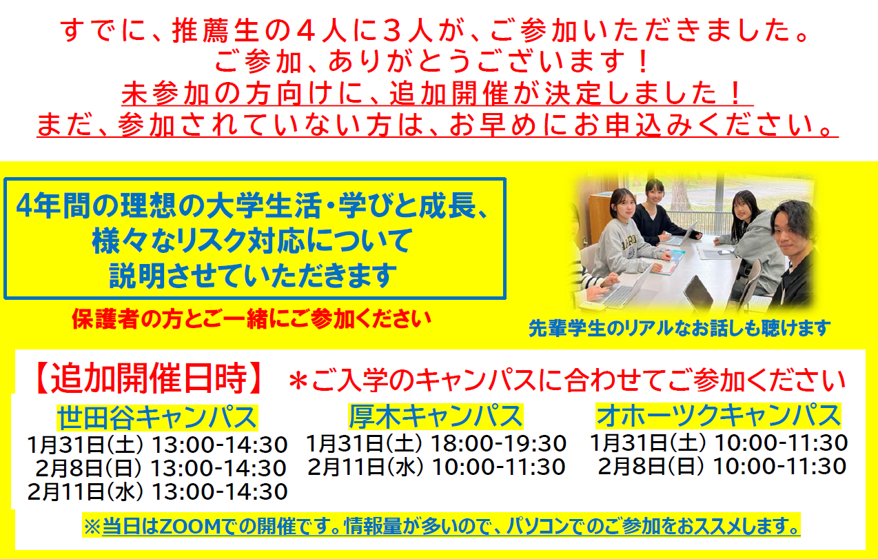 まだ参加されていない新入生・保護者の皆さまは、ぜひ、追加日程の日に、ご参加ください!