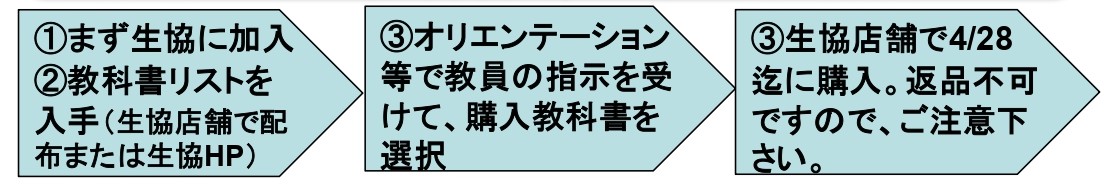 オリエンテーションなどで先生の指示を受けてから、生協店舗で購入してください。(一部、特設会場や教室で販売する場合があります)