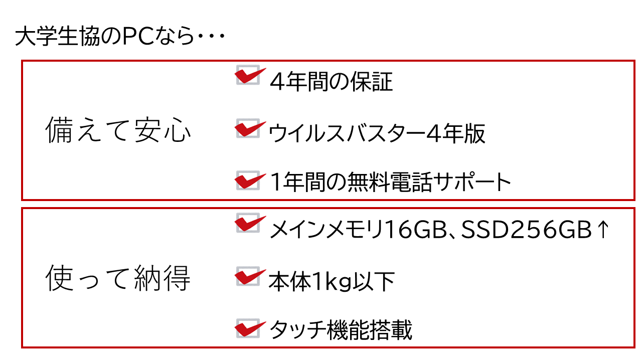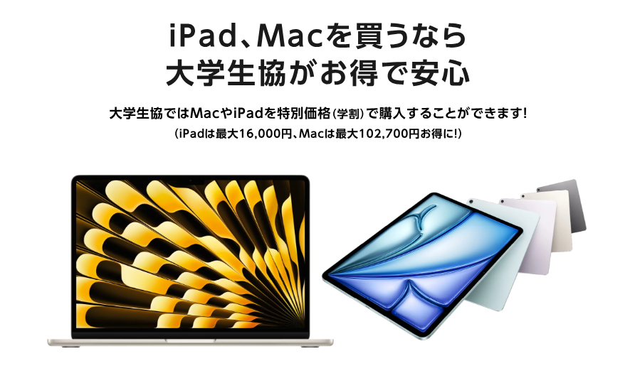メモリやストレージ、キーボードなどお好みの構成でMacBook AirやMacBook Proのカスタマイズを承ることができます!ぜひ生協にご相談ください。
