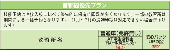 首都圏優先プランでは技能予約は一般予約(1〜3時間)に対して、優先的に常時6時間保有以上、または、段階毎の一括予約ができます。